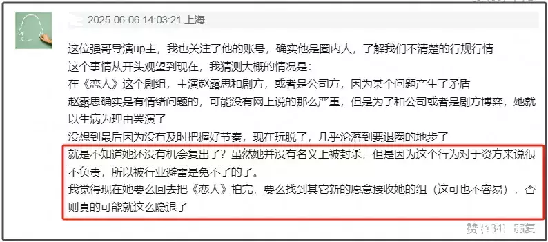 而赵露念念之是以被反噬亦然作念法太不谈德。事实是赵露念念、剧组、经纪公司三方是相互牵制的,剧组与经纪公司矍铄协议,经纪公司与艺东谈主有协议,艺东谈主不按协议作事,剧组只可跟经纪公司打讼事。不少网友看到业内分析赵露念念为杀青个东谈主主义不顾大局,直言“夸大生病现象”的操格调险太大,很有可能被业内避雷。